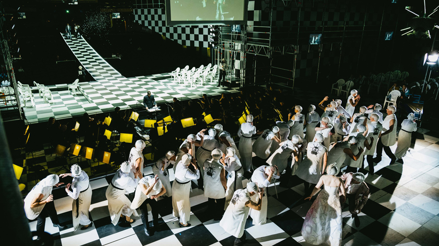 Abbildung 2. Veränderter Grundraum mit Schachbrettmuster, Orchester auf eingesenkten Hubpodien und Steg durch das Parkett. Don Giovanni von Wolfgang Amadeus Mozart. Regie: Paul-Georg Dittrich, Bühne: Sebastian Hannak, Kostüme: Anna Rudolph